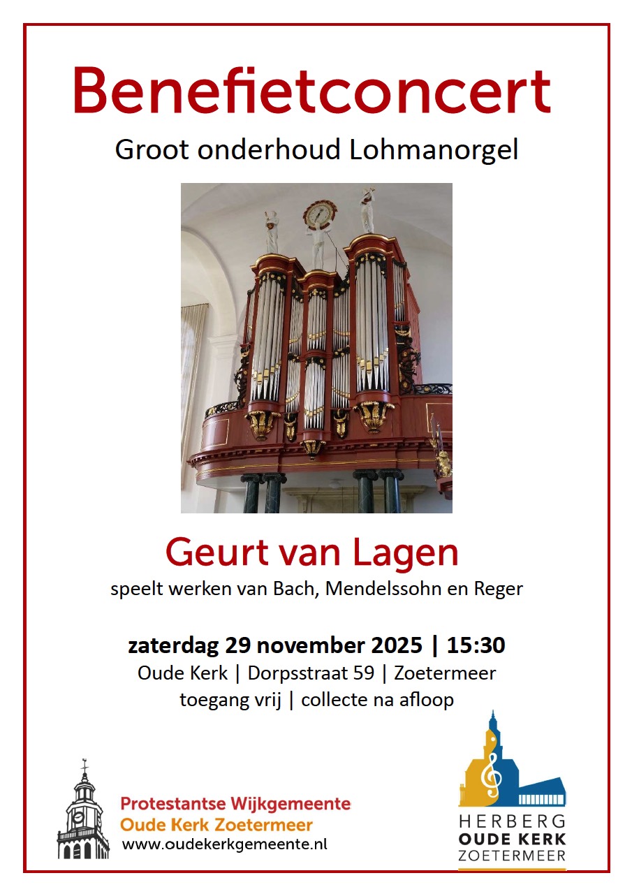 Lohmanorgel in de Oude Kerk Zoetermeer is in de afgelopen jaren aan de binnenzijde sterk vervuild geraakt. Voor het behoud van het orgel de komende jaren is een grondige schoonmaak nodig.In het najaar van 2025 krijgt het orgel daarom een grote onderhoudsbeurt. Voor de schoonmaakbeurt dient het pijpwerk uit het orgel genomen en schoon gemaakt te worden, dit betreft 1343 pijpen. Dat is een arbeidsintensief karwei en kost dus een lieve duit, naar verwachting ruim € 40.000. Een deel daarvan is al binnen, maar voor de verdere aanvulling worden verschillende acties georganiseerd, zoals dit Benefietconcert.