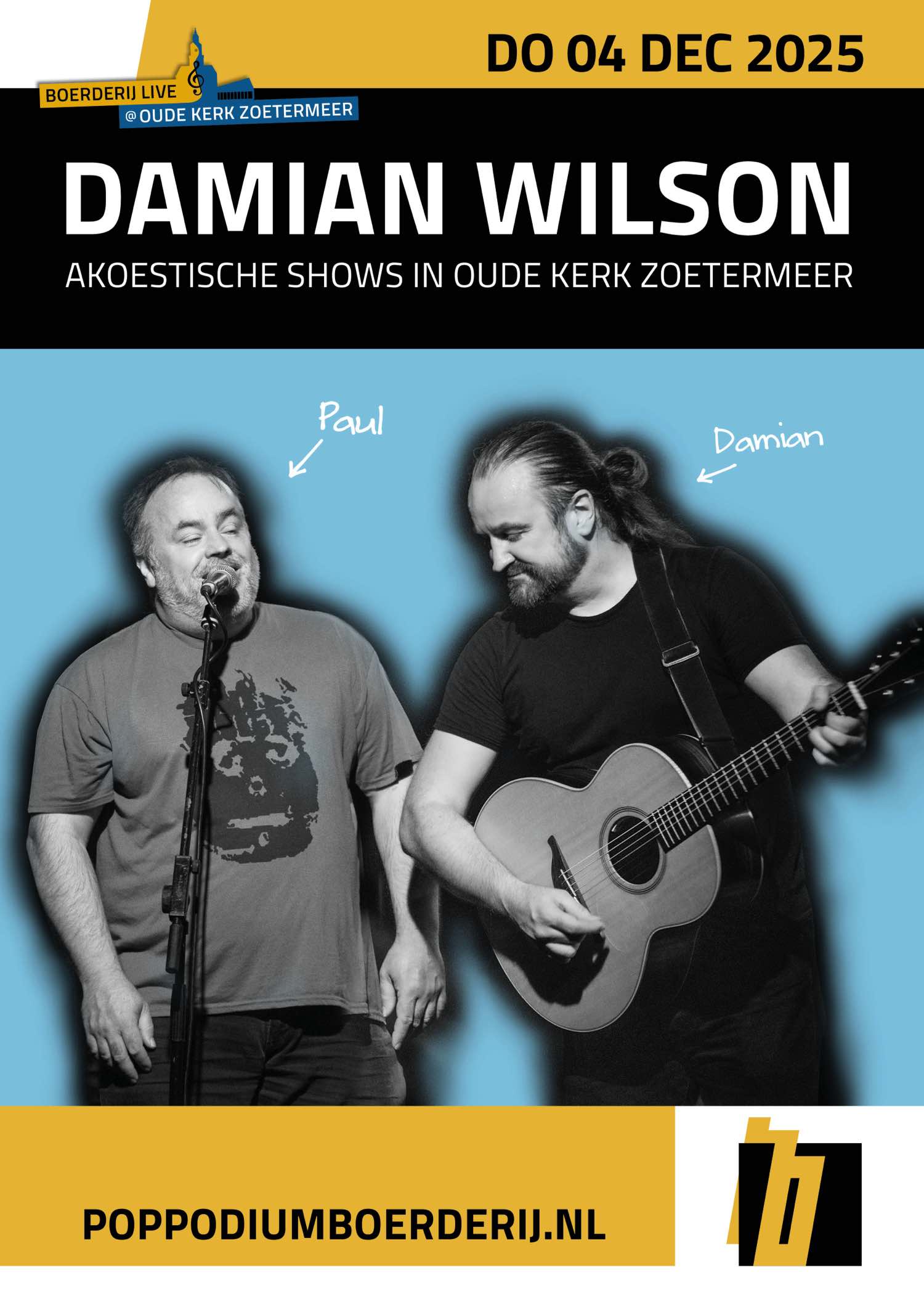 En waar kan dit laatste beter tot zijn recht komen dan in de intieme setting van een kerk. Op woensdag 3 december en donderdag 4 december is de Oude Kerk in Zoetermeer het decor van deze akoestische show van Damian, waarin hij wordt vergezeld door zijn broer Paul Wilson. Dit bijzondere optreden zit vol met vocale harmonieën, die alleen de Wilsons samen kunnen brengen. Maar ook verhalen over de Wilson-familie, zowel goede als slechte.