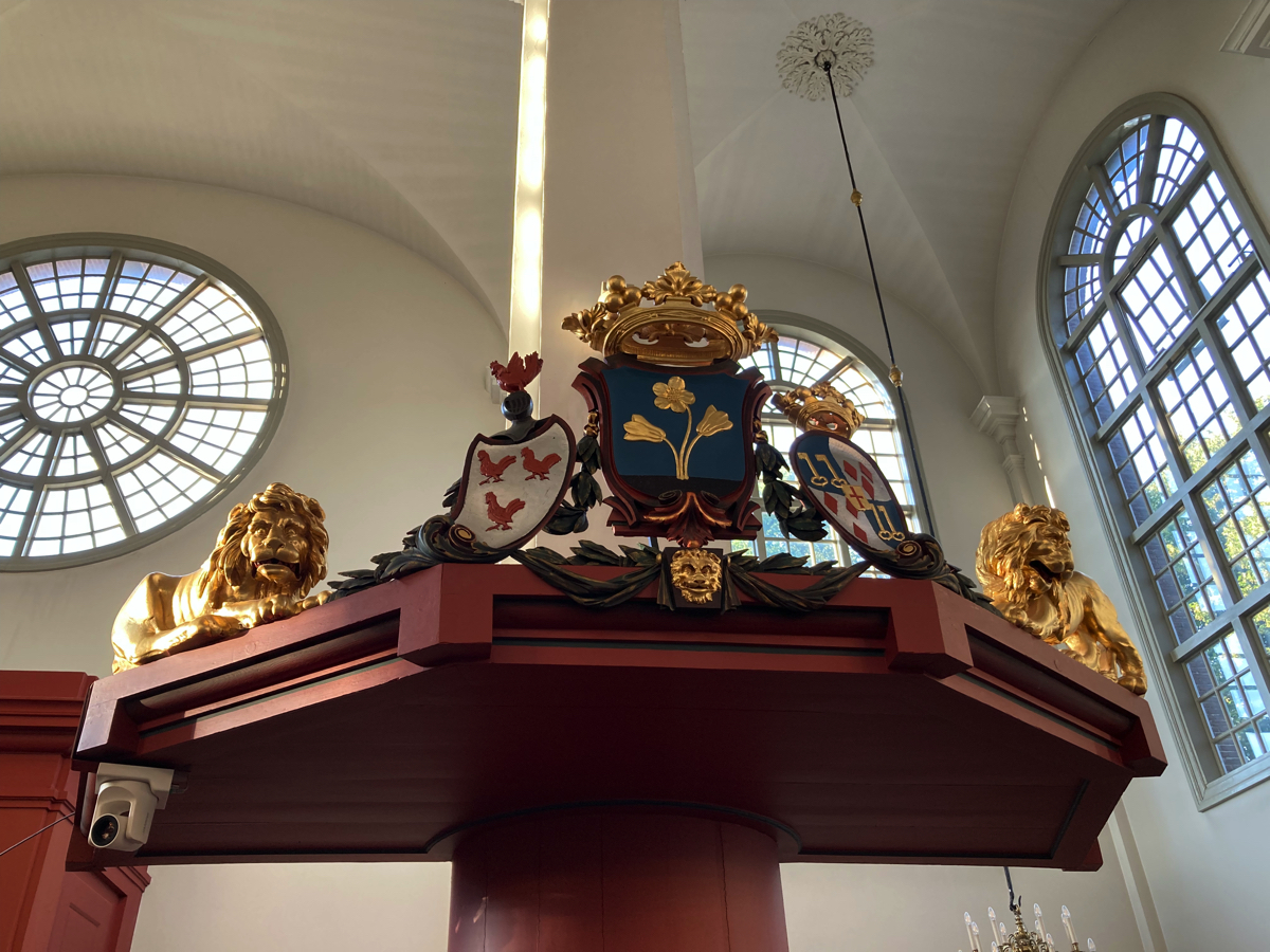 De rechter herenbank van Zoetermeer draagt de wapens van mr. Gerard van Aalst Schouten, ambachtsheer van Zoetermeer, en van zijn echtgenote Elisabeth van Reverhorst.